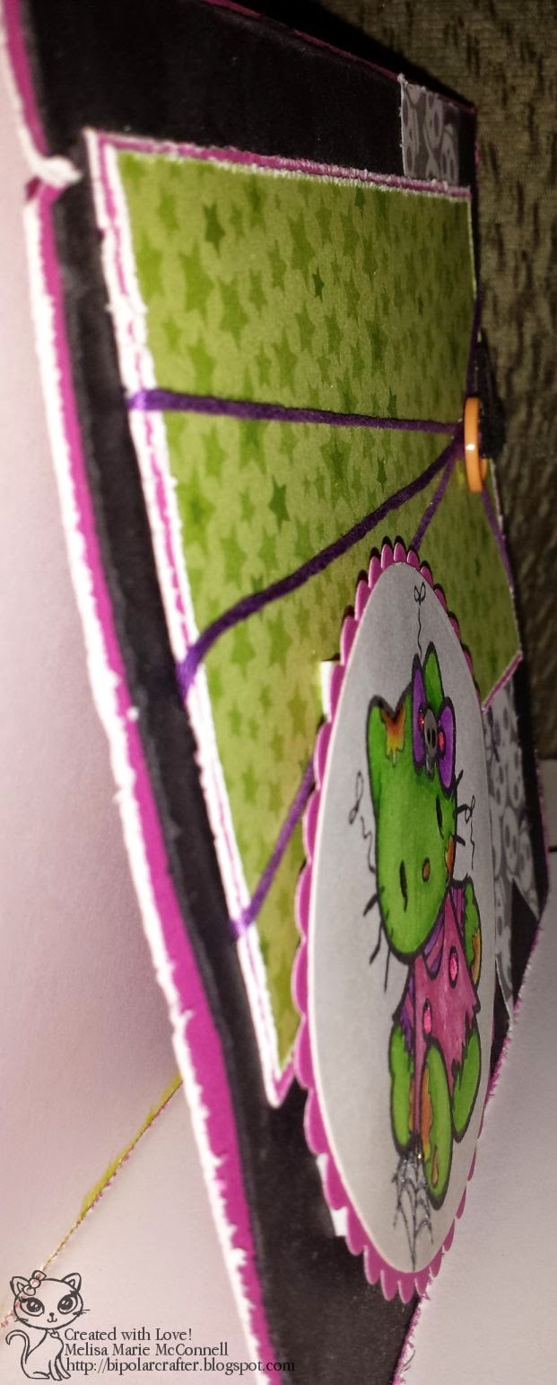 I added a cute orange button (to match her wounds) and used a glue dot and a huge glob of glossy accents to get that bat to stick on there!